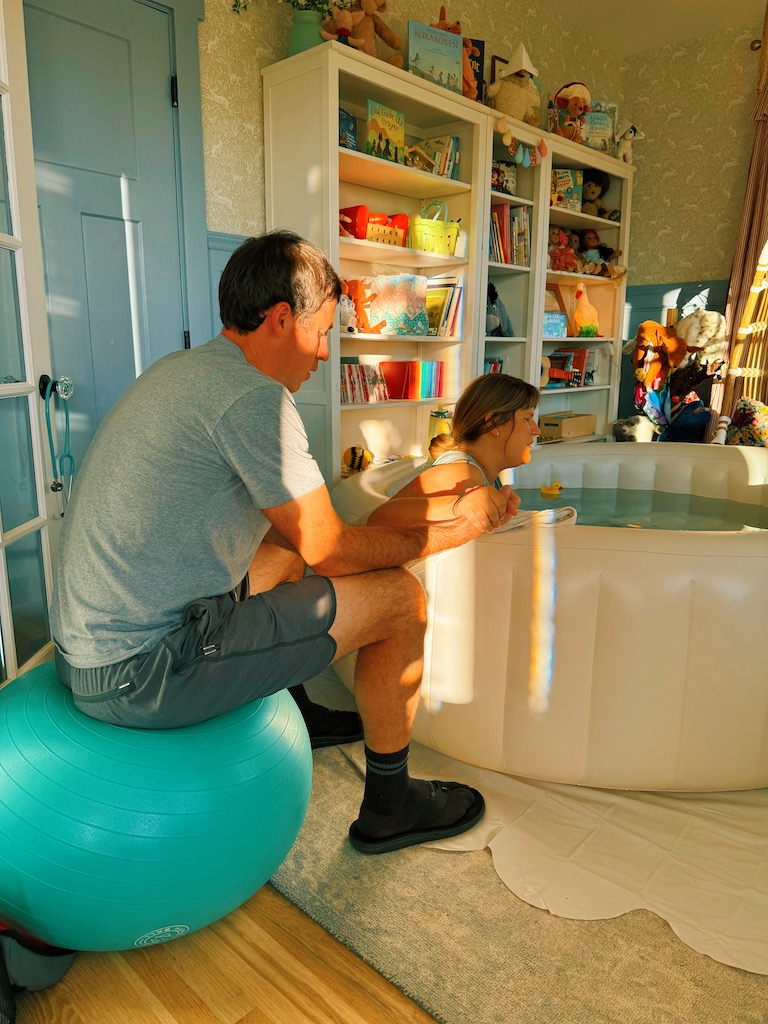 Around 7pm the student midwife arrived, and I was in the birth pool in the toy room by the front door. She introduced herself and in between a contraction I joked, “Hi there! I gotta say, I’ve never met somebody in a pool (half naked) before.”