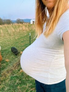 Finally, at 41 weeks and 1 days of pregnancy, I began to have afternoon daytime contractions in addition to nighttime. But again, they stopped in the morning. In the afternoon of 41 weeks and 2 days, I had show alongside the contractions. I had a hard time trusting if labor were starting or not at this point and decided to go on a walk and pray. I walked around our field where the sheep and pigs and chickens followed along and prayed and listened to Scripture and my Christian hypnobirthing app (as I had so many nights during this pregnancy–which was wonderfully helpful). Contractions continued from about 4pm onward.